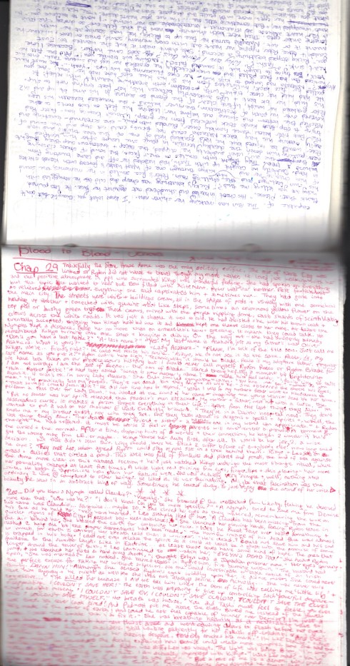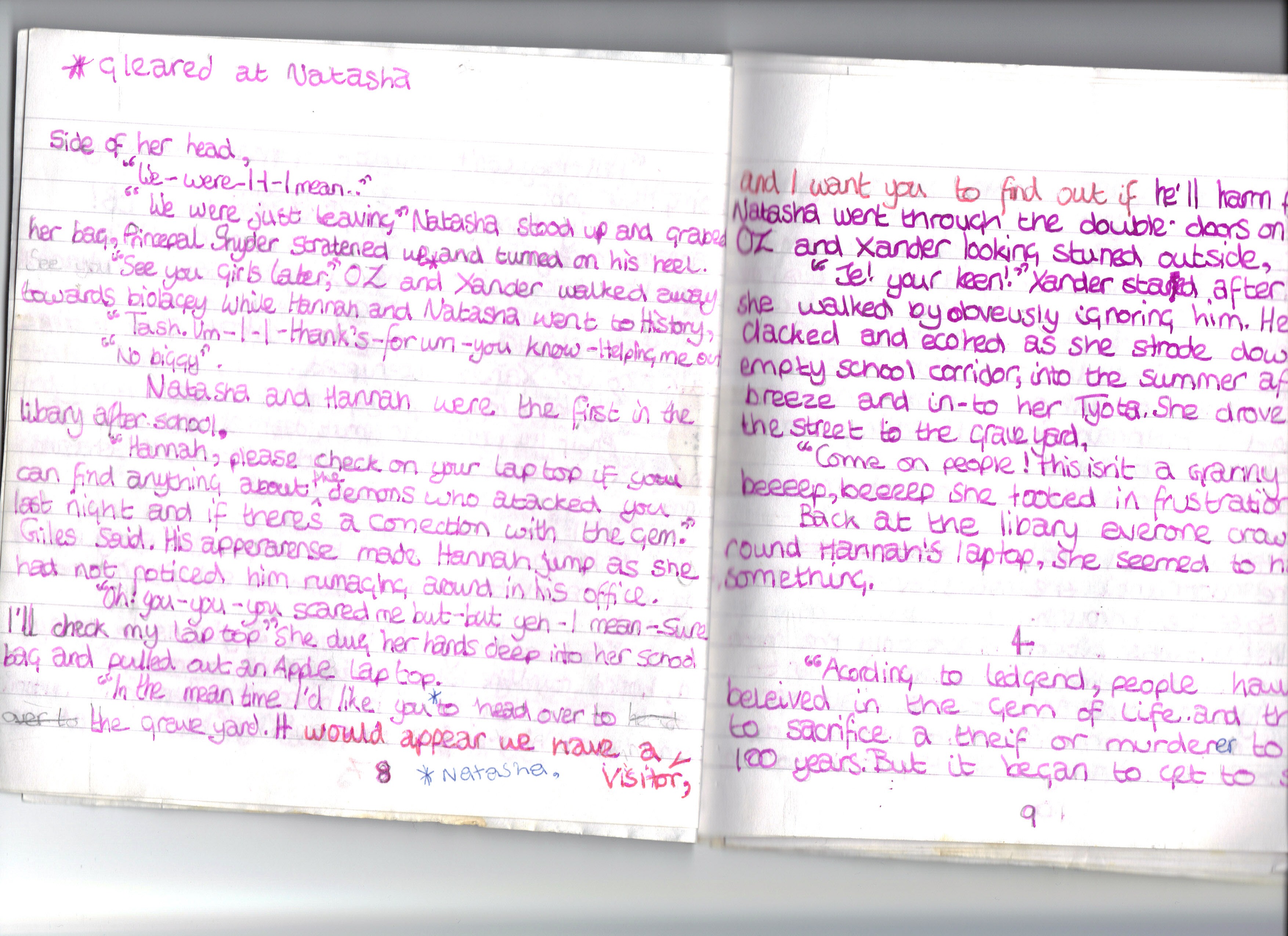 After three years of planning, drawing and writing I have a third draft of the story in the works. From ‘Natasha and Hannah, the Vampire Slayers’ it has become Scars in the System. An epic three part fantasy novel with original characters, intricate politics, a messed up religion, racial messages and six invented worlds. I hand wrote 400 A4 pages (still in multi-coloured ink, might I add).