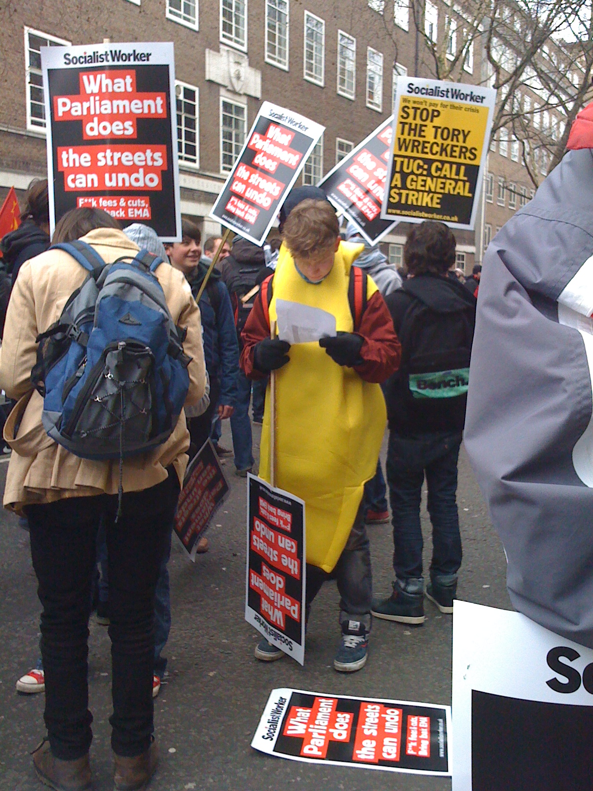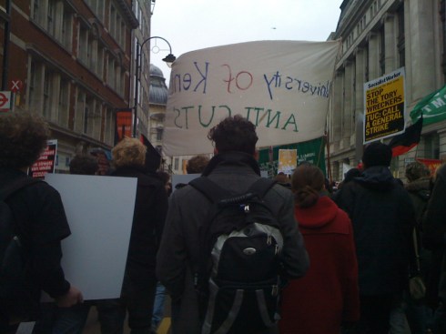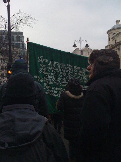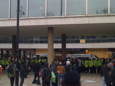 Through the streets we paraded chants and songs galore. I’d never been through that part of London before, so I had a refreshing view at the same time. Police locked pedestrians into Topshop and stood guard of it (afraid we’d overrun it and make camp again, I suppose). I was surprised they let us march past Millbank (see: we broke windows last time) but I suppose the wall of policemen two lines thick was enough to stop sensible people trying a second demonstration. It was kinda hilarious, especially as the windows are still bordered up.